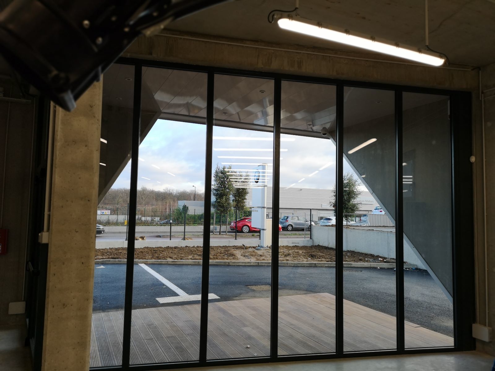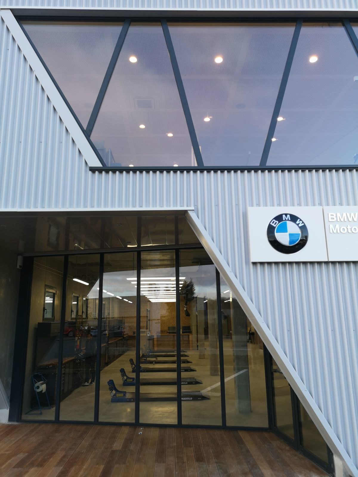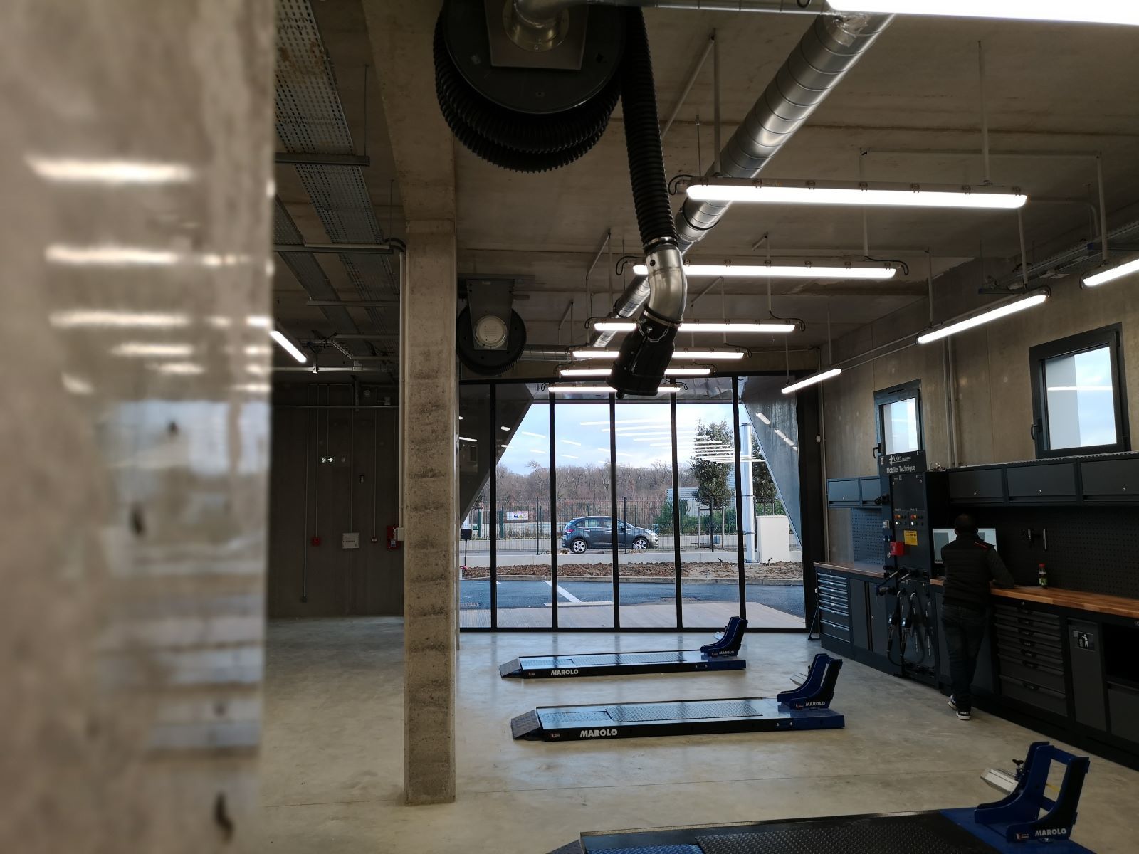 Dans un soucis de coût maîtrisé, le bâtiment se dote d'une vêture classique type bac acier mais en utilisant deux coloris afin de générer une dynamique aux façades. Toujours dans ce soucis de rythme et de dynamisme, les angles sont tronqués pour casser l'effet "boîte". La ligne "biaise" revient également au travers de l'aménagement intérieur mais aussi sur les menuiseries principales.