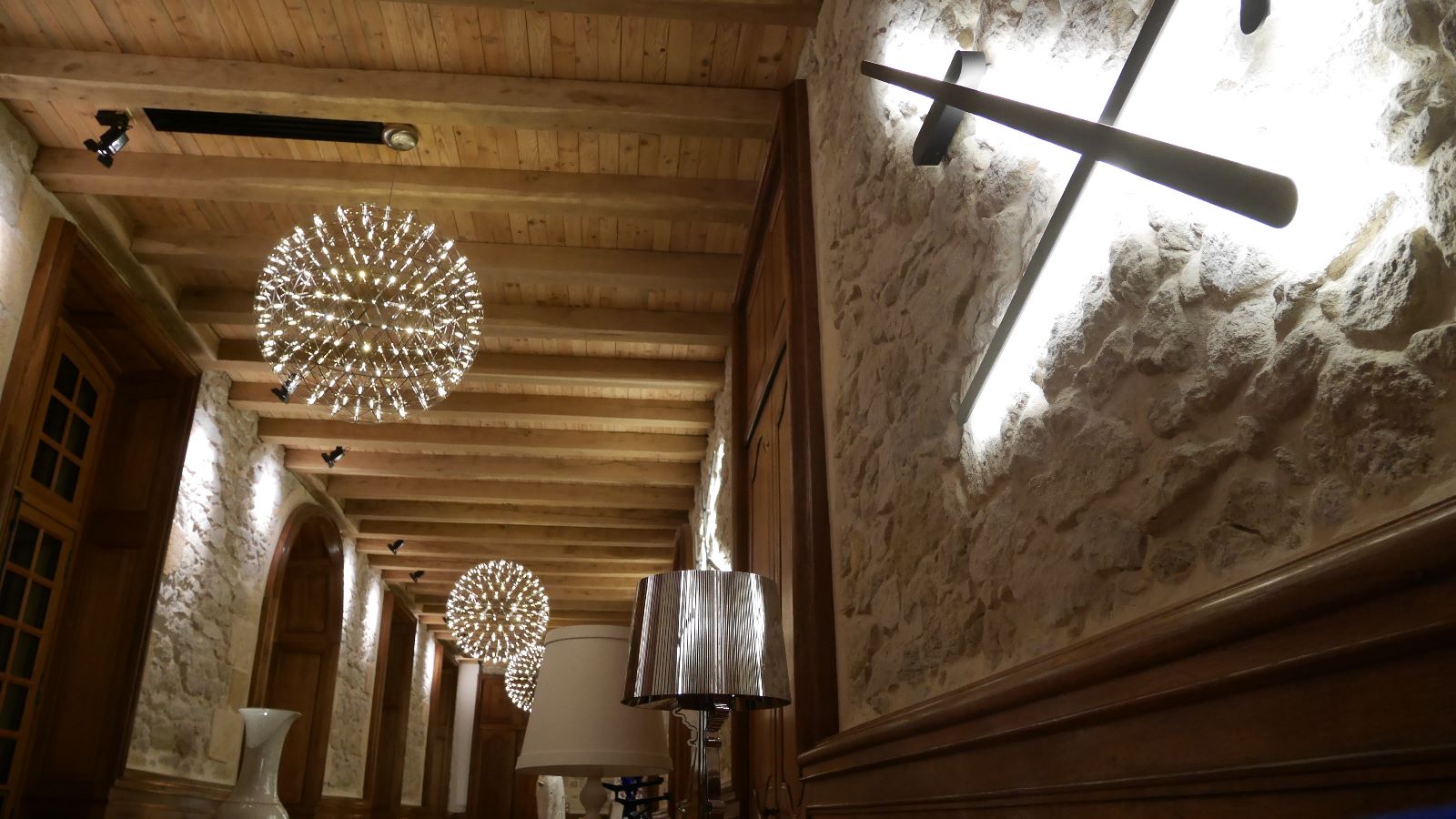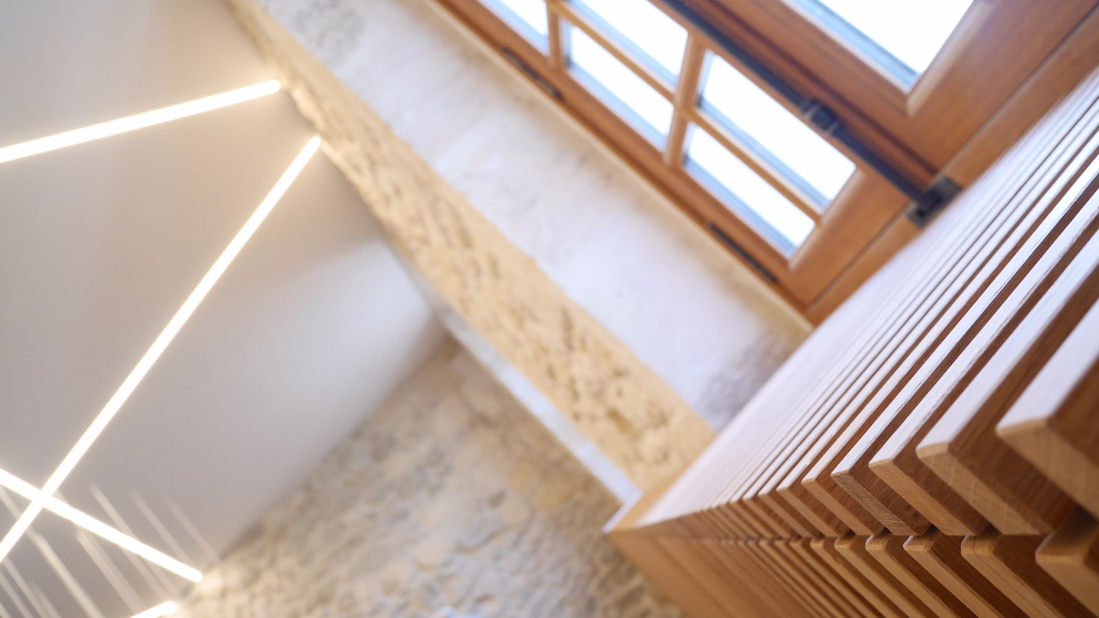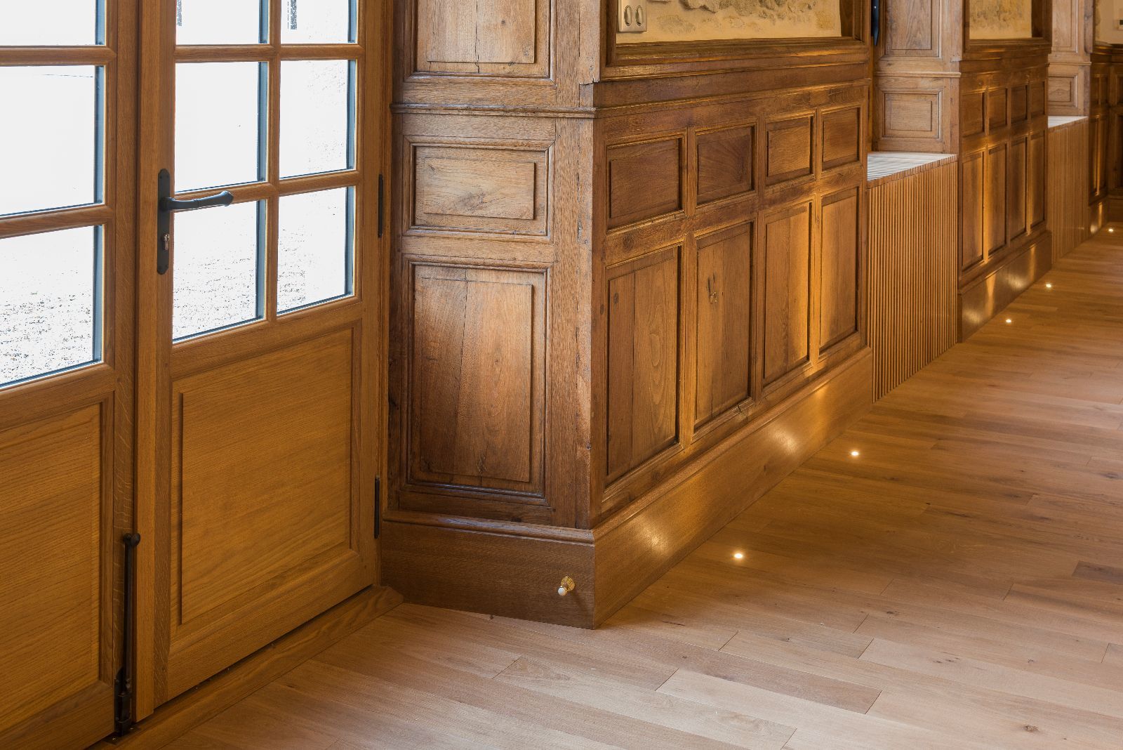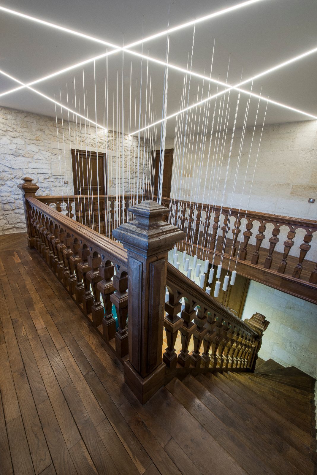 Le premier impact visuel est classique, ancien, mais une seconde lecture plus contemporaine apparait par transparence au travers des vitres, notamment par les éclairages en zigzag visibles en second jour dans le vestibule.